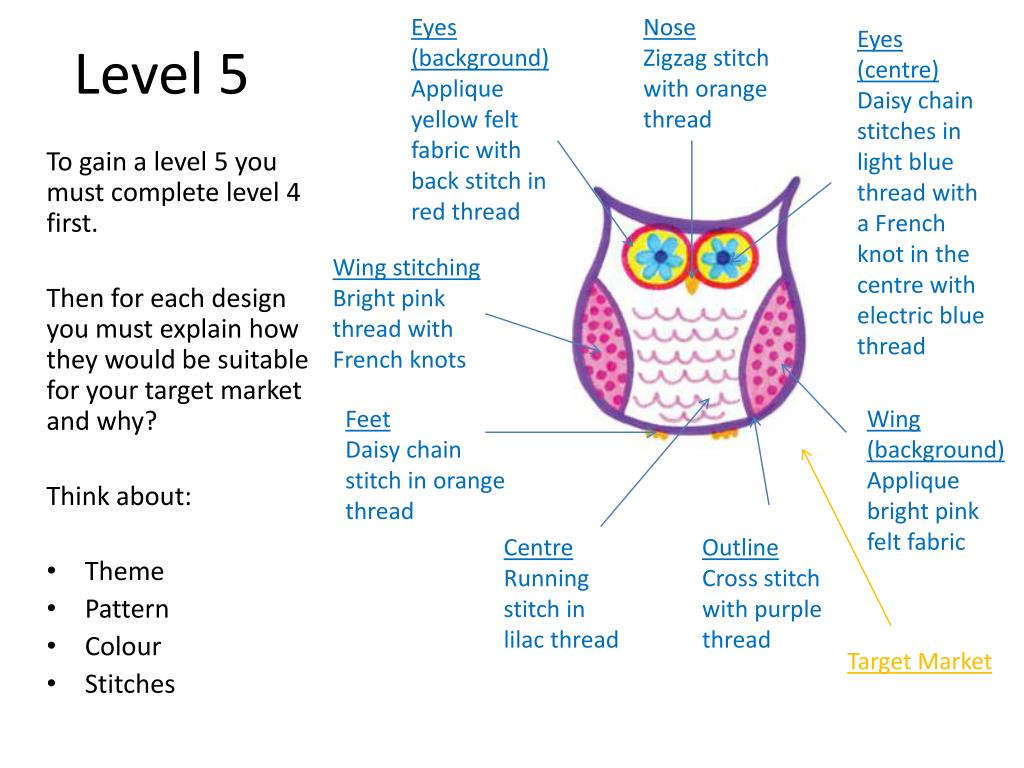 Eyes (background) Applique yellow felt fabric with back stitch in red thread Nose Zigzag stitch with orange thread Eyes (centre) Daisy chain stitches in light blue thread with a French knot in the centre with electric blue thread Level 6 To gain a level 6you must complete level 4 and 5 first. Then for each design you must link your specification to the design, is it the same or have you made any changes, if so explain why. You must also include a list of equipment needed to create your design. Wing stitching Bright pink thread with French knots Feet Daisy chain stitch in orange thread Wing (background) Applique bright pink felt fabric Centre Running stitch in lilac thread Outline Cross stitch with purple thread Equipment Target Market Specification