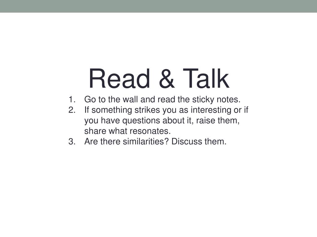 Read & Talk Go to the wall and read the sticky notes. If something strikes you as interesting or if you have questions about it, raise them, share what resonates. Are there similarities? Discuss them.