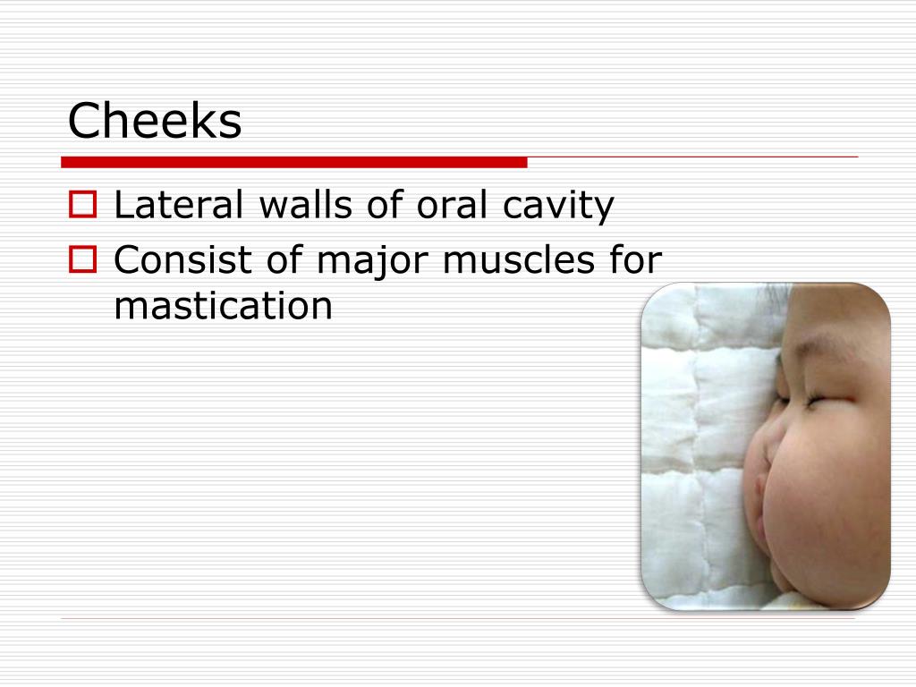 Cheeks • Lateral walls of oral cavity • Consist of major muscles for mastication