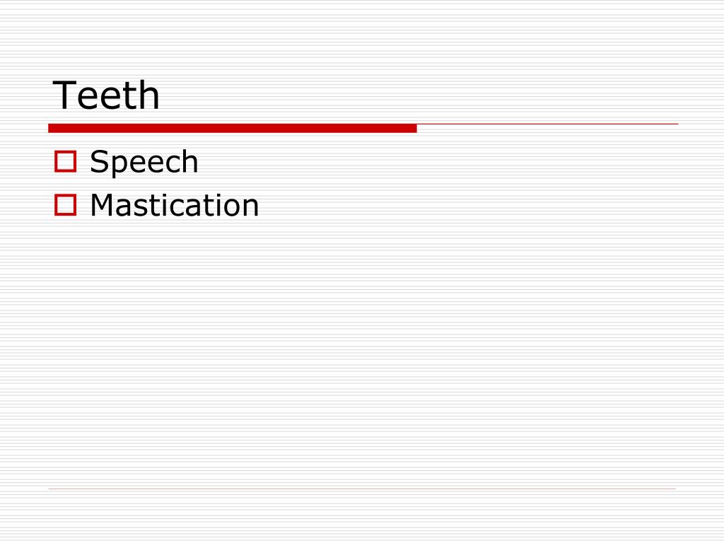 Deciduous (primary) Appear = 6 mos. Continue to = 4 yrs For each jaw: 2 central incisors 2 lateral incisors 2 cuspids or canines 4 molars 20 total Loss begins = 6 yrs Permanent (secondary) For each jaw: 2 central incisors 2 lateral incisors 2 cuspids or canines 4 bicuspids 6 molars 3rd molars or wisdom teeth appear = 17-25 yrs Teeth (Dentitions)Rest in alveolar processes