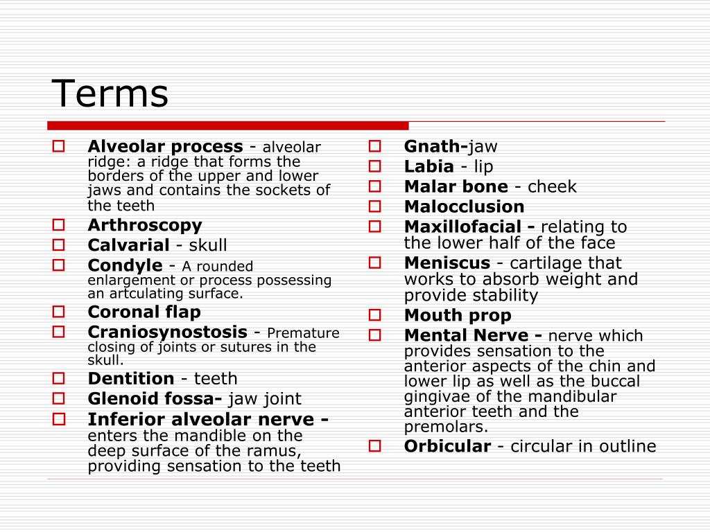 Alveolar process - alveolar ridge: a ridge that forms the borders of the upper and lower jaws and contains the sockets of the teeth Arthroscopy Calvarial - skull Condyle - A rounded enlargement or process possessing an artculating surface. Coronal flap Craniosynostosis - Premature closing of joints or sutures in the skull. Dentition - teeth Glenoidfossa- jaw joint Inferior alveolar nerve -enters the mandible on the deep surface of the ramus, providing sensation to the teeth Gnath-jaw Labia - lip Malar bone - cheek Malocclusion Maxillofacial - relating to the lower half of the face Meniscus - cartilage that works to absorb weight and provide stability Mouth prop Mental Nerve - nerve which provides sensation to the anterior aspects of the chin and lower lip as well as the buccalgingivae of the mandibular anterior teeth and the premolars. Orbicular- circular in outline Terms