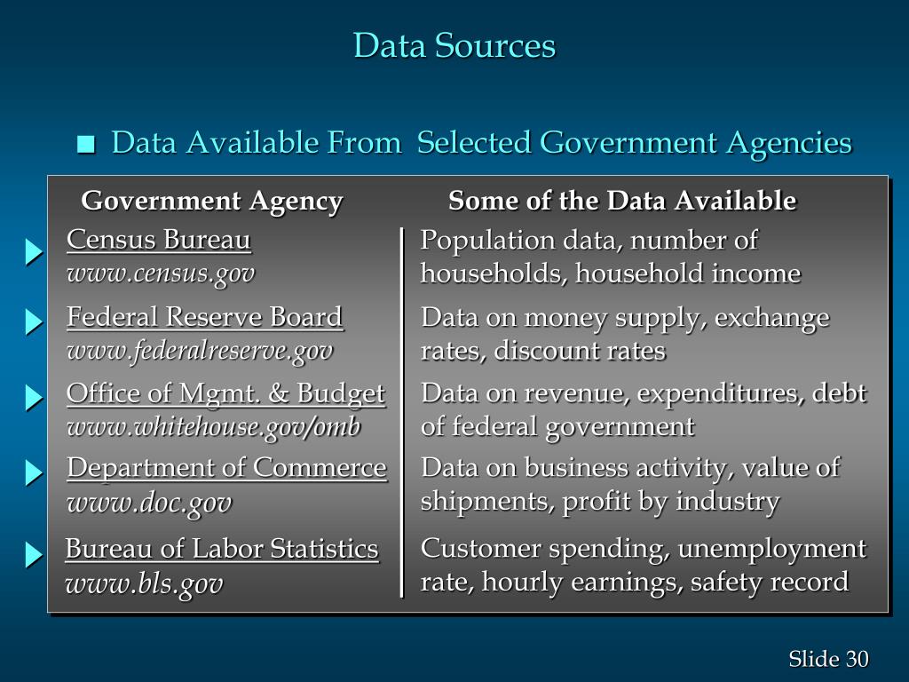 Data Sources Government Agency Some of the Data Available • Data Available From Selected Government Agencies Census Bureau www.census.gov Population data, number of households, household income Data on money supply, exchange rates, discount rates Federal Reserve Board www.federalreserve.gov Data on revenue, expenditures, debt of federal government Office of Mgmt. & Budget www.whitehouse.gov/omb Department of Commerce www.doc.gov Data on business activity, value of shipments, profit by industry Bureau of Labor Statistics www.bls.gov Customer spending, unemployment rate, hourly earnings, safety record