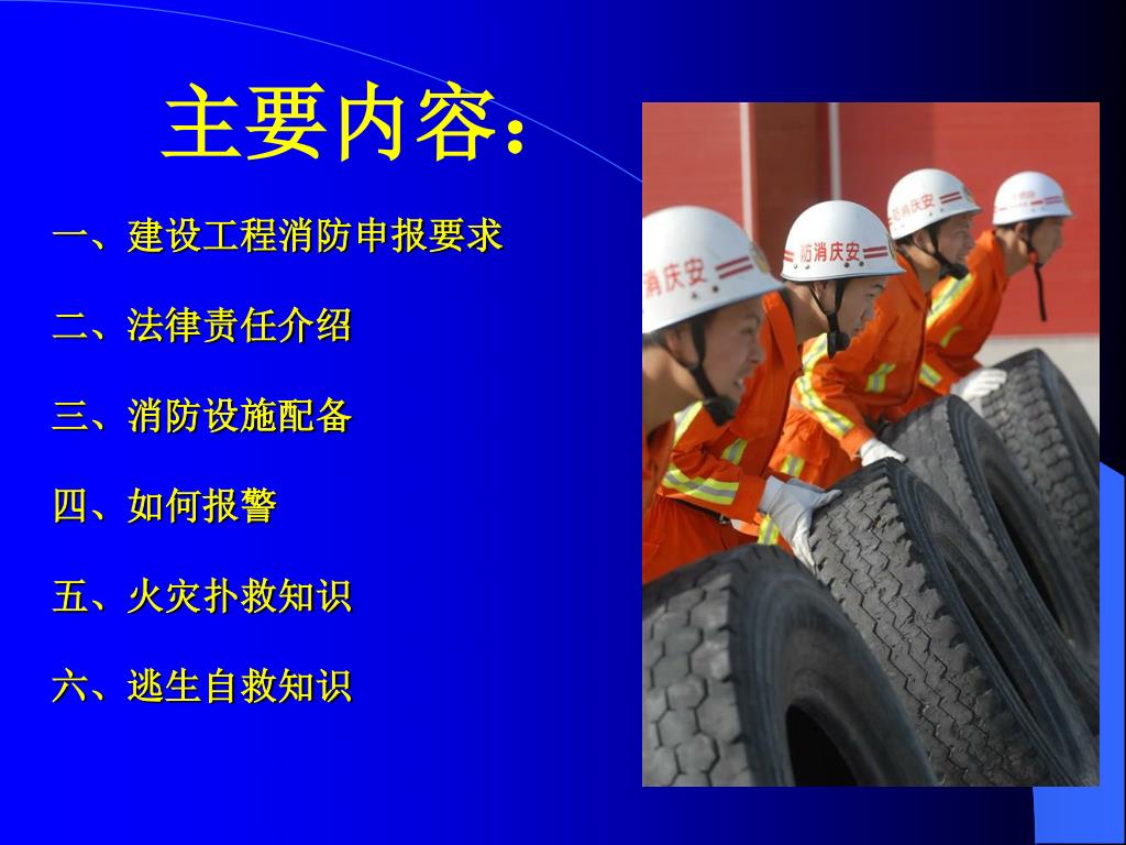 主要内容: 一、建设工程消防申报要求 二、法律责任介绍 三、消防设施配备 四、如何报警 五、火灾扑救知识 六、逃生自救知识