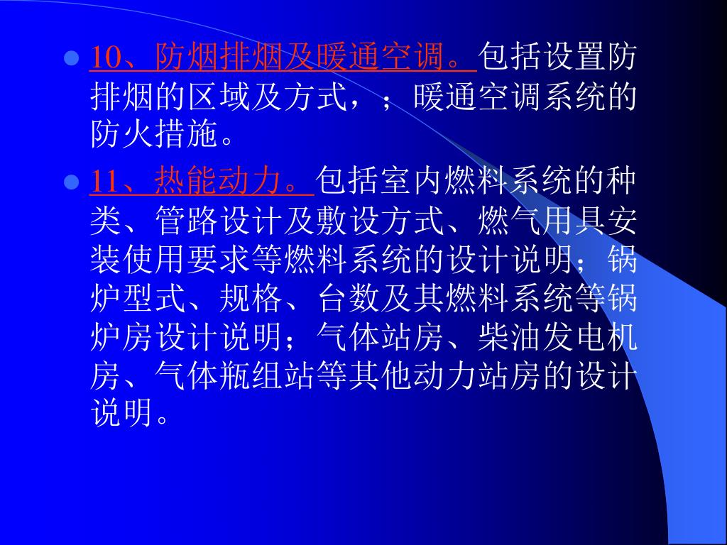 10、防烟排烟及暖通空调。包括设置防排烟的区域及方式,;暖通空调系统的防火措施。10、防烟排烟及暖通空调。包括设置防排烟的区域及方式,;暖通空调系统的防火措施。 • 11、热能动力。包括室内燃料系统的种类、管路设计及敷设方式、燃气用具安装使用要求等燃料系统的设计说明;锅炉型式、规格、台数及其燃料系统等锅炉房设计说明;气体站房、柴油发电机房、气体瓶组站等其他动力站房的设计说明。