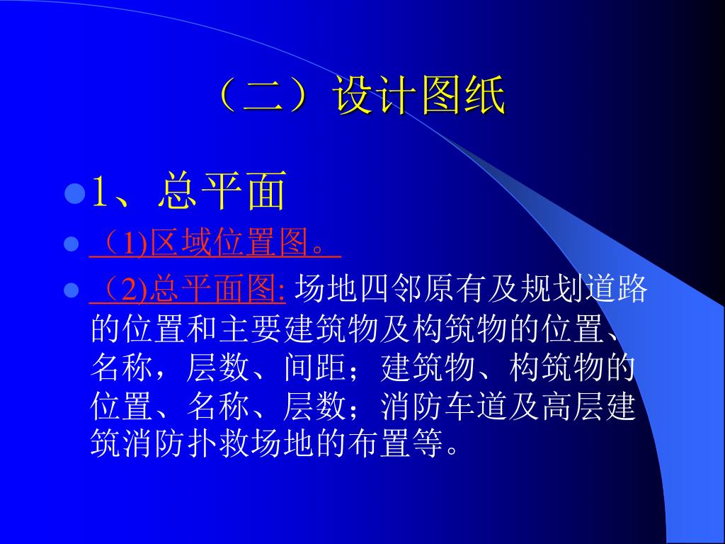 (二)设计图纸 • 1、总平面 • (1)区域位置图。 • (2)总平面图:场地四邻原有及规划道路的位置和主要建筑物及构筑物的位置、名称,层数、间距;建筑物、构筑物的位置、名称、层数;消防车道及高层建筑消防扑救场地的布置等。