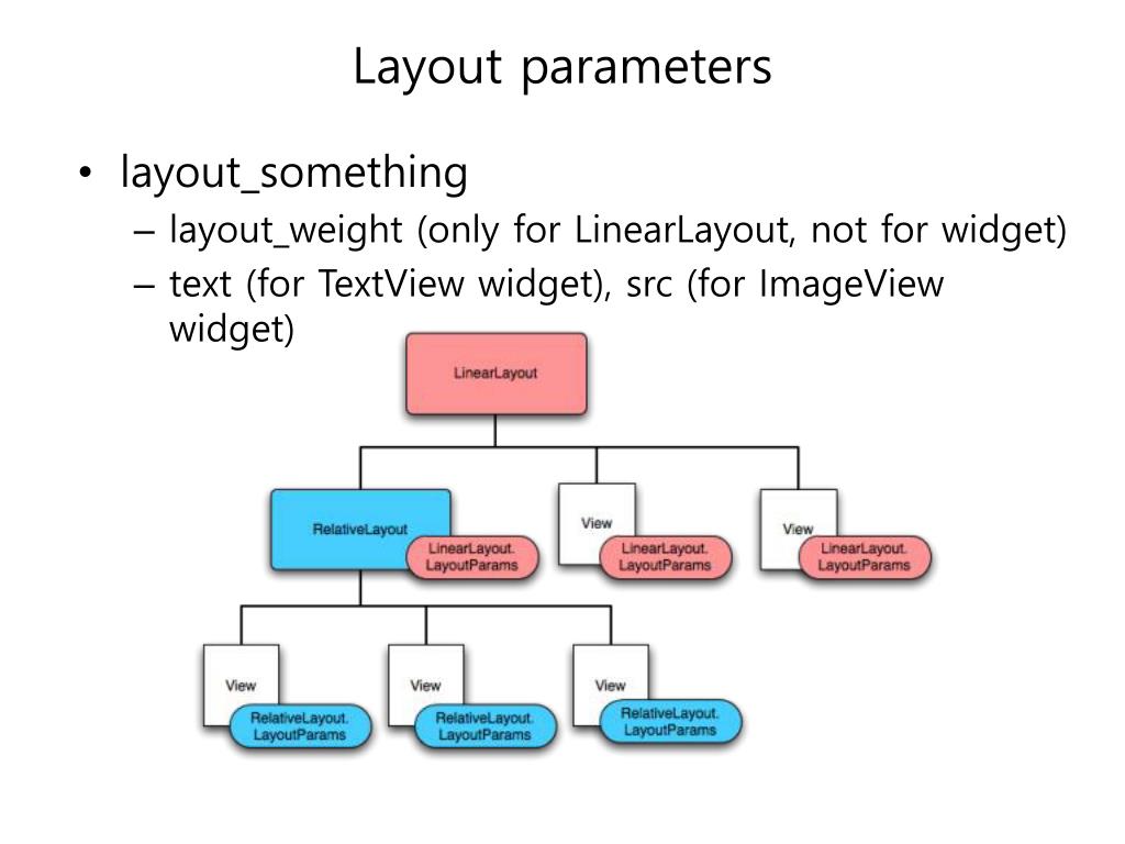 Layout parameters • layout_something • layout_weight (only for LinearLayout, not for widget) • text (for TextView widget), src (for ImageView widget)