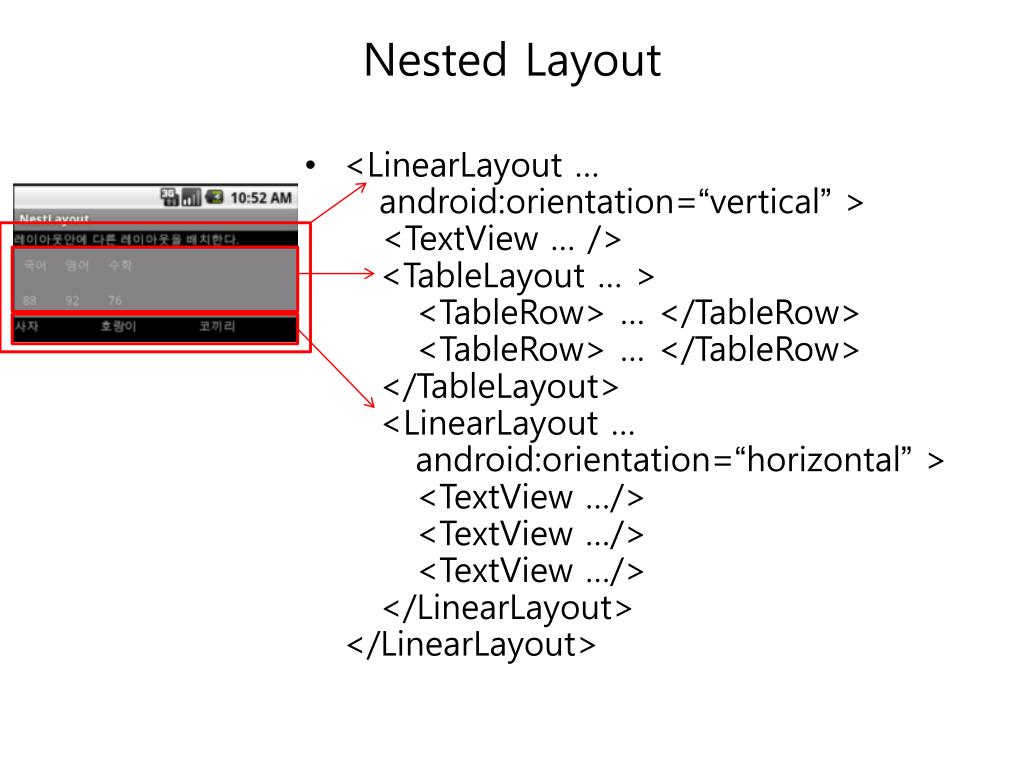 Nested Layout • <LinearLayout … android:orientation=“vertical” ><TextView… /> <TableLayout … > <TableRow> … </TableRow> <TableRow> … </TableRow> </TableLayout> <LinearLayout …android:orientation=“horizontal”> <TextView …/> <TextView …/> <TextView …/> </LinearLayout></LinearLayout>