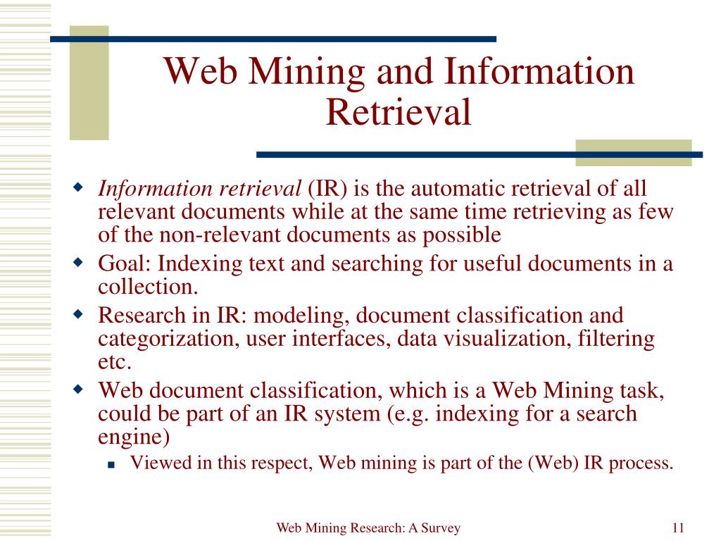 Web Mining and Information Retrieval • Information retrieval (IR) is the automatic retrieval of all relevant documents while at the same time retrieving as few of the non-relevant documents as possible • Goal: Indexing text and searching for useful documents in a collection. • Research in IR: modeling, document classification and categorization, user interfaces, data visualization, filtering etc. • Web document classification, which is a Web Mining task, could be part of an IR system (e.g. indexing for a search engine) • Viewed in this respect, Web mining is part of the (Web) IR process. Web Mining Research: A Survey