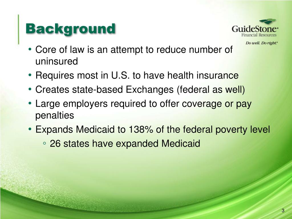 Background • Core of law is an attempt to reduce number of uninsured • Requires most in U.S. to have health insurance • Creates state-based Exchanges (federal as well) • Large employers required to offer coverage or pay penalties • Expands Medicaid to 138% of the federal poverty level • 26 states have expanded Medicaid