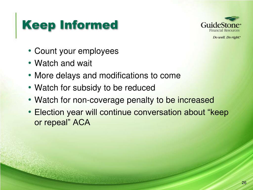 Keep Informed • Count your employees • Watch and wait • More delays and modifications to come • Watch for subsidy to be reduced • Watch for non-coverage penalty to be increased • Election year will continue conversation about “keep or repeal” ACA