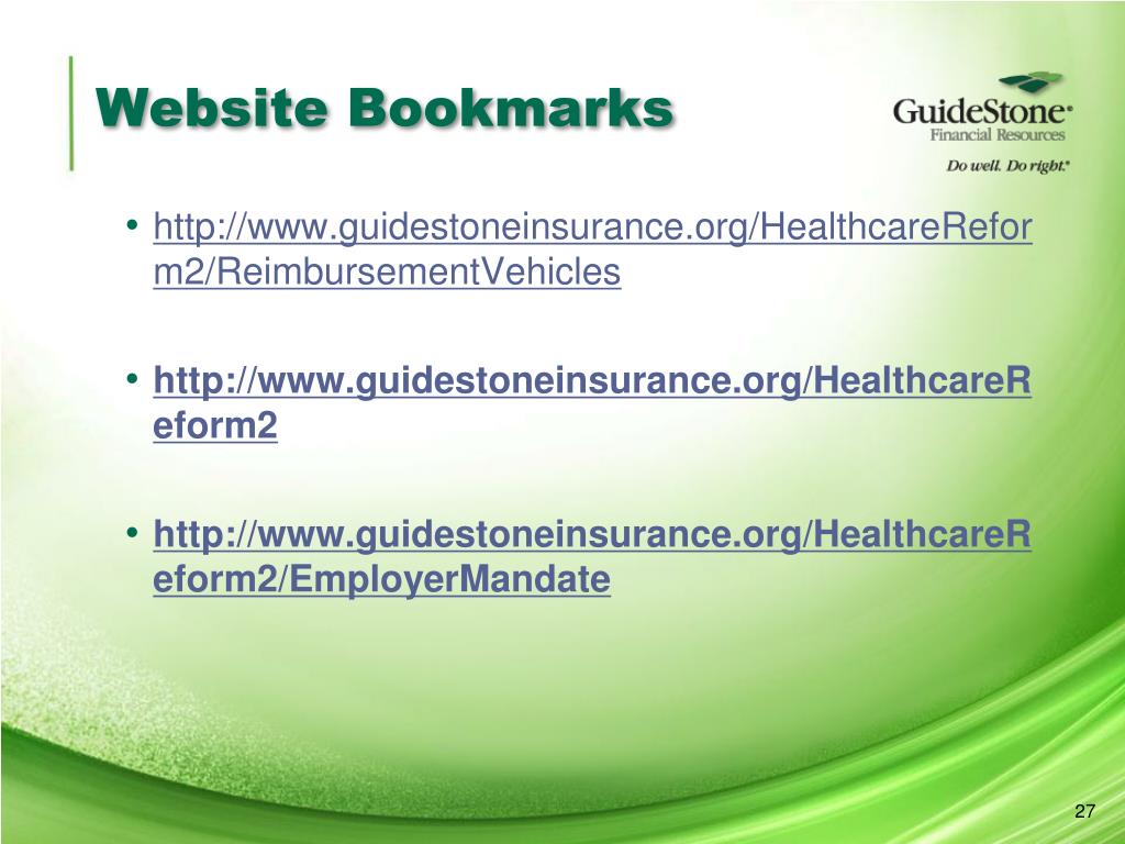 Website Bookmarks • http://www.guidestoneinsurance.org/HealthcareReform2/ReimbursementVehicles • http://www.guidestoneinsurance.org/HealthcareReform2 • http://www.guidestoneinsurance.org/HealthcareReform2/EmployerMandate