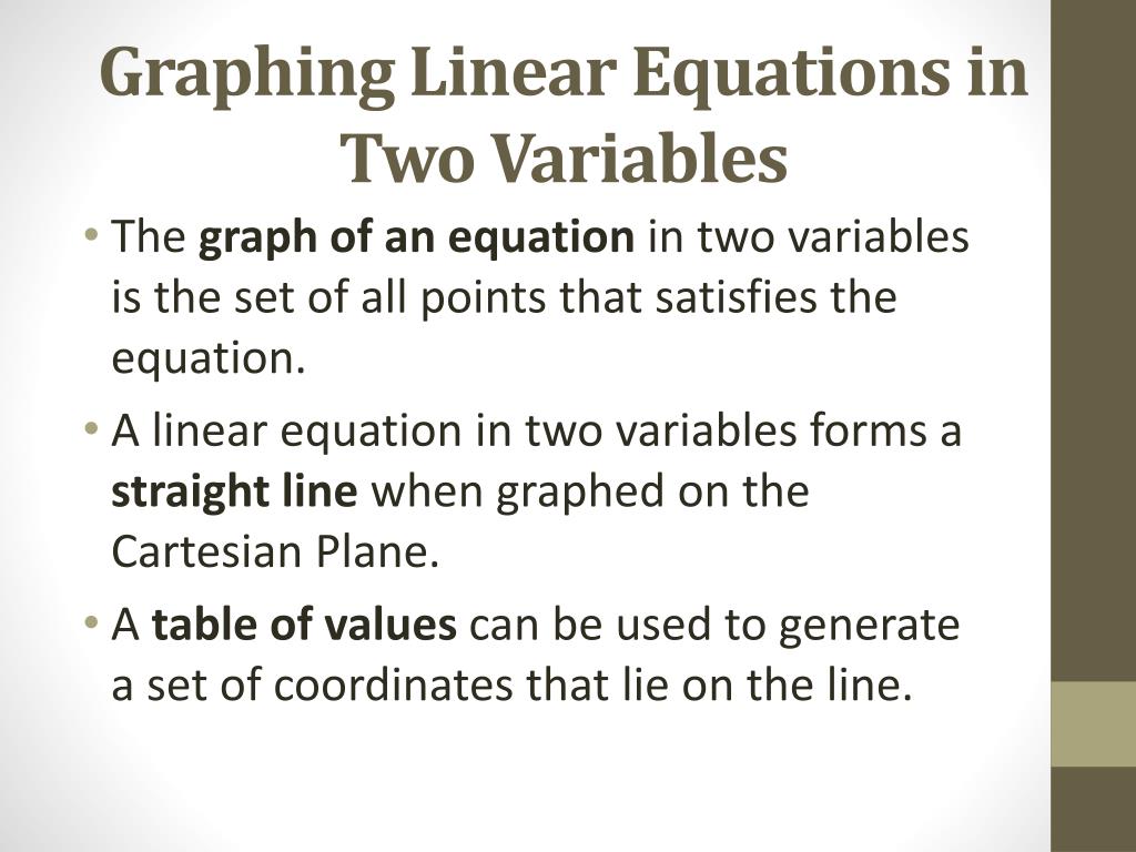 Graphing Linear Equations in Two Variables • The graph of an equation in two variables is the set of all points that satisfies the equation. • A linear equation in two variables forms a straightline when graphed on the Cartesian Plane. • A table of values can be used to generate a set of coordinates that lie on the line.
