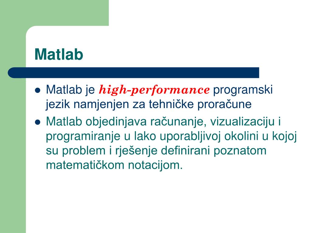 Matlab • Matlab je high-performance programski jezik namjenjen za tehničke proračune • Matlab objedinjava računanje, vizualizaciju i programiranje u lako uporabljivoj okolini u kojoj su problem i rješenje definirani poznatom matematičkom notacijom.