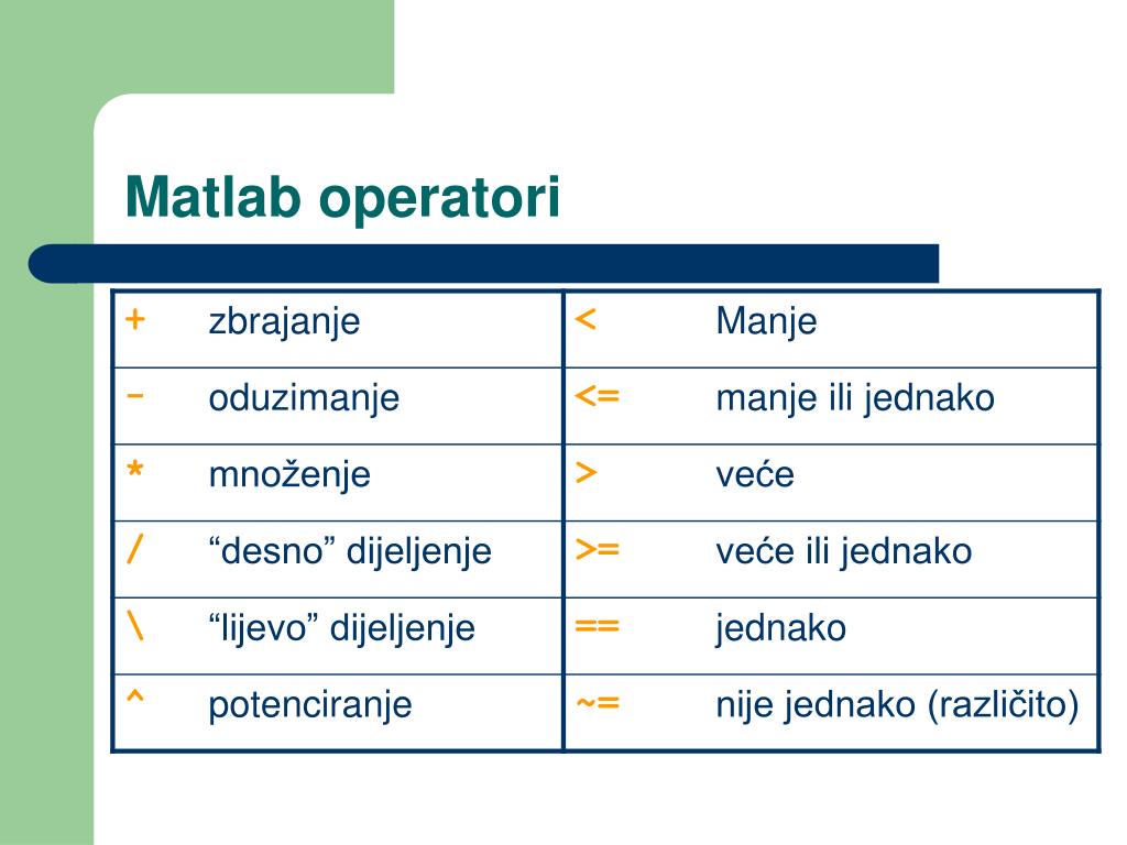 Korištenje Matlaba • Naredbe za MATLAB unosimo u komandni prozor, osnovni prozor MATLABa primjer: >> 3*cos(2*pi/3)/sqrt(23) • Pored naredbi MATLABa, u komandnom prozoru vrijede i naredbe operativnog sustava primjer – promjena radnog direktorija: >> cd <ime_direktorija>
