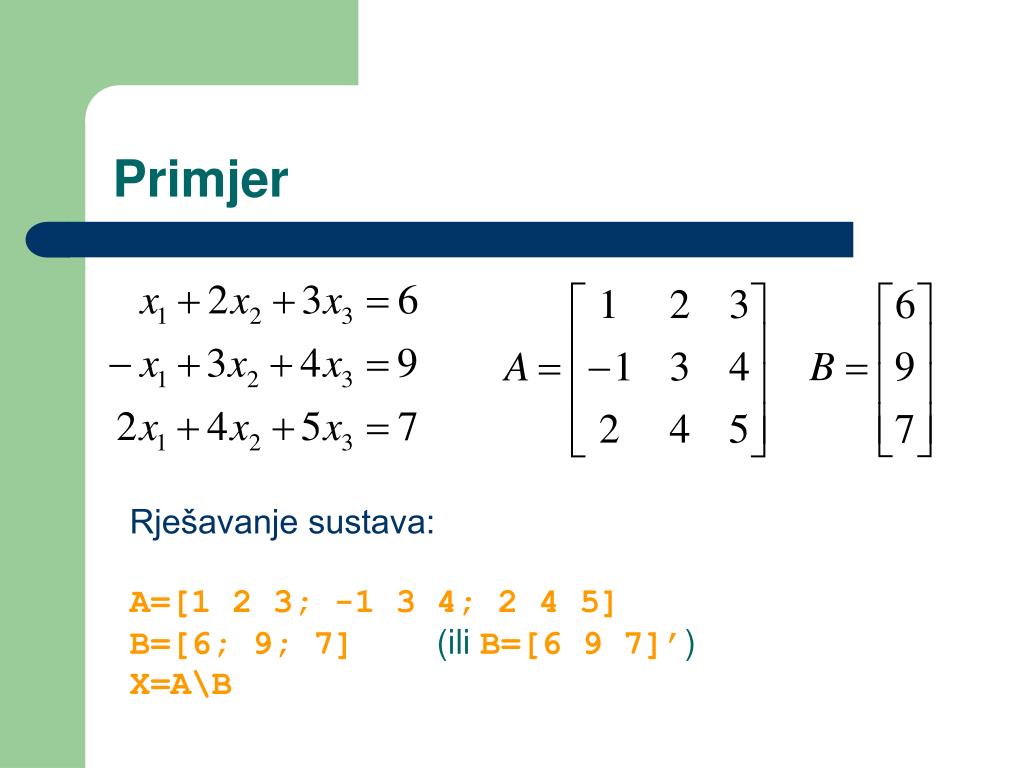 Primjer Rješavanje sustava: A=[1 2 3; -1 3 4; 2 4 5] B=[6; 9; 7] (ili B=[6 9 7]’) X=A\B