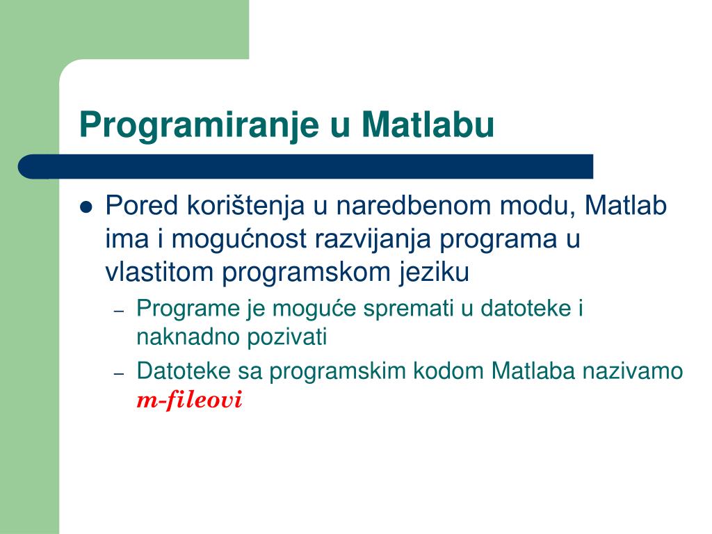 Programiranje u Matlabu • Pored korištenja u naredbenom modu, Matlab ima i mogućnost razvijanja programa u vlastitom programskom jeziku • Programe je moguće spremati u datoteke i naknadno pozivati • Datoteke sa programskim kodom Matlaba nazivamom-fileovi