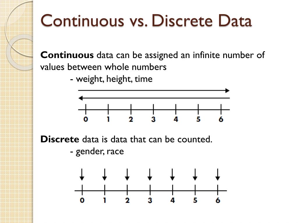 Continuous vs. Discrete Data Continuous data can be assigned an infinite number of values between whole numbers - weight, height, time Discrete data is data that can be counted. - gender, race