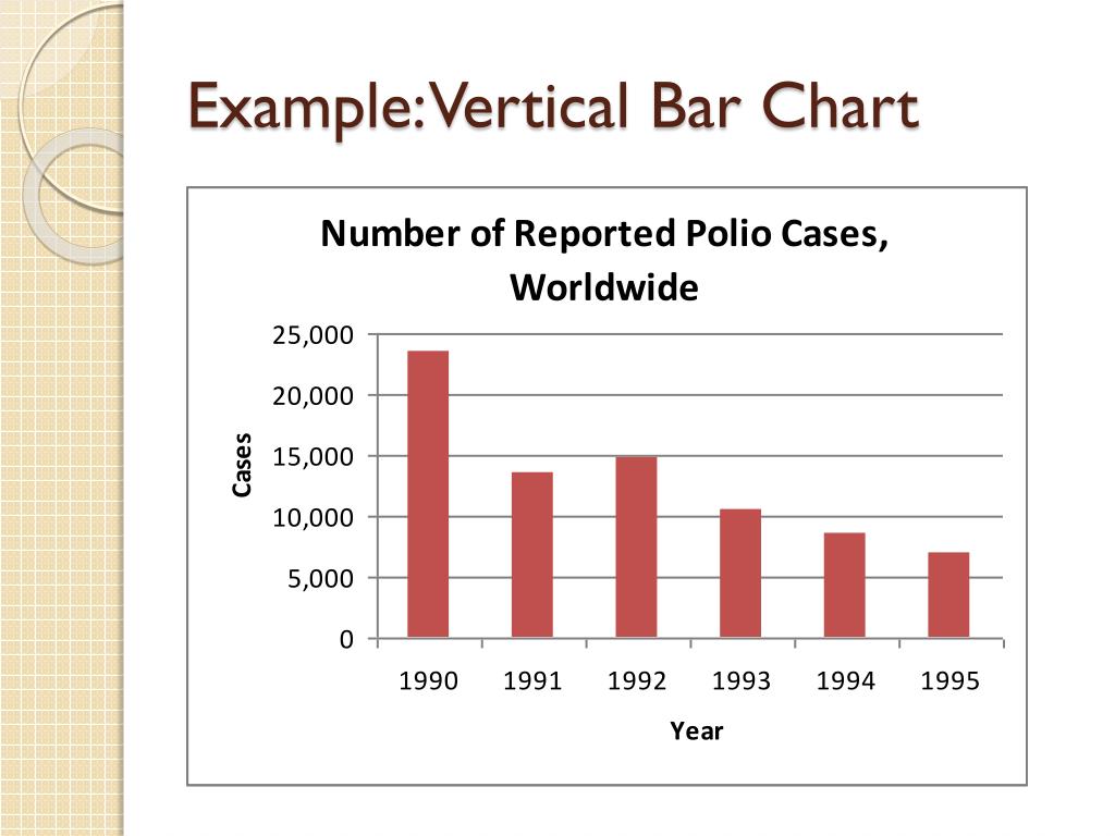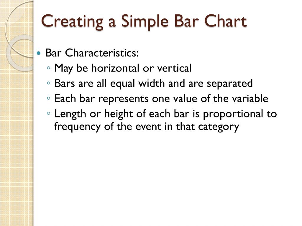 Creating a Simple Bar Chart • Bar Characteristics: • May be horizontal or vertical • Bars are all equal width and are separated • Each bar represents one value of the variable • Length or height of each bar is proportional to frequency of the event in that category