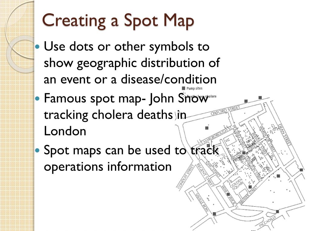 Creating a Spot Map • Use dots or other symbols to show geographic distribution of an event or a disease/condition • Famous spot map- John Snow tracking cholera deaths in London • Spot maps can be used to track operations information