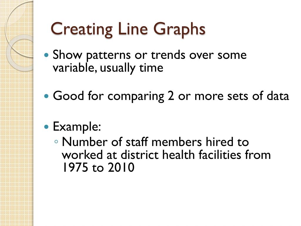 Creating Line Graphs • Show patterns or trends over some variable, usually time • Good for comparing 2 or more sets of data • Example: • Number of staff members hired to worked at district health facilities from 1975 to 2010