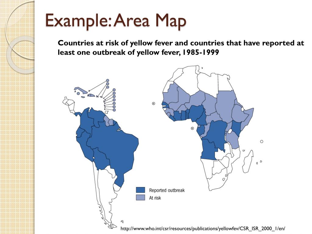 Example: Area Map Countries at risk of yellow fever and countries that have reported at least one outbreak of yellow fever, 1985-1999 http://www.who.int/csr/resources/publications/yellowfev/CSR_ISR_2000_1/en/