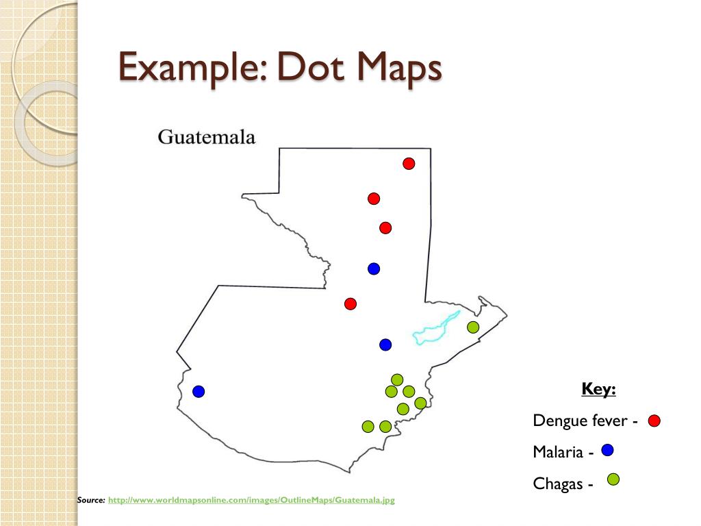 Example: Dot Maps Key: Dengue fever - Malaria - Chagas - Source: http://www.worldmapsonline.com/images/OutlineMaps/Guatemala.jpg