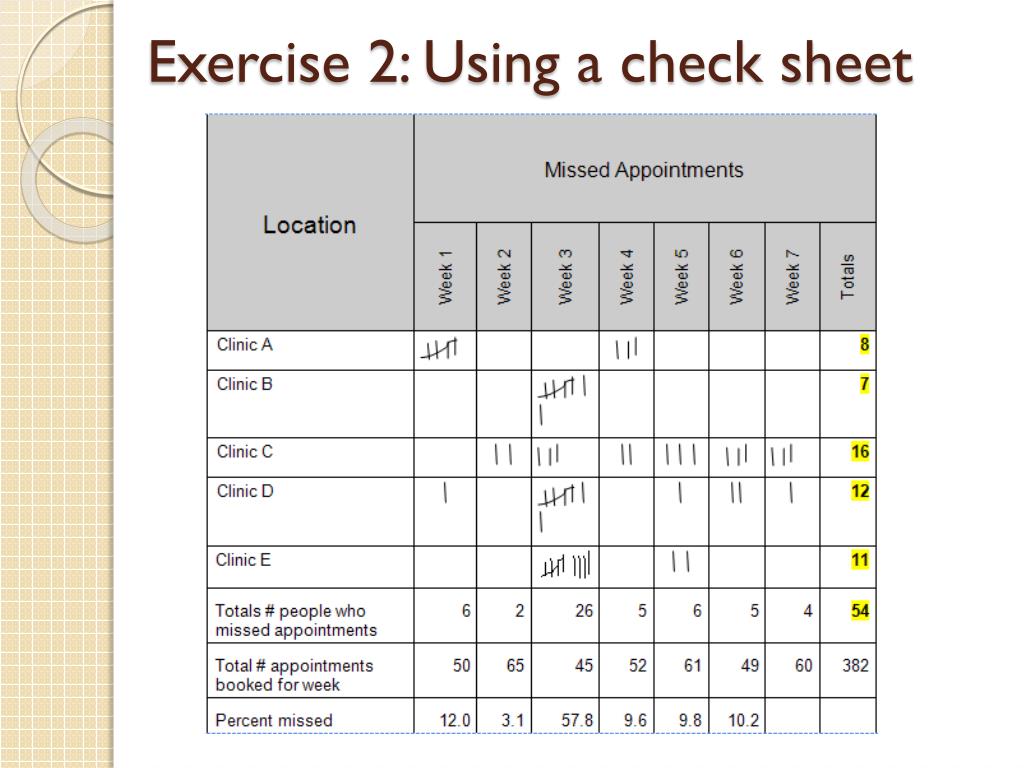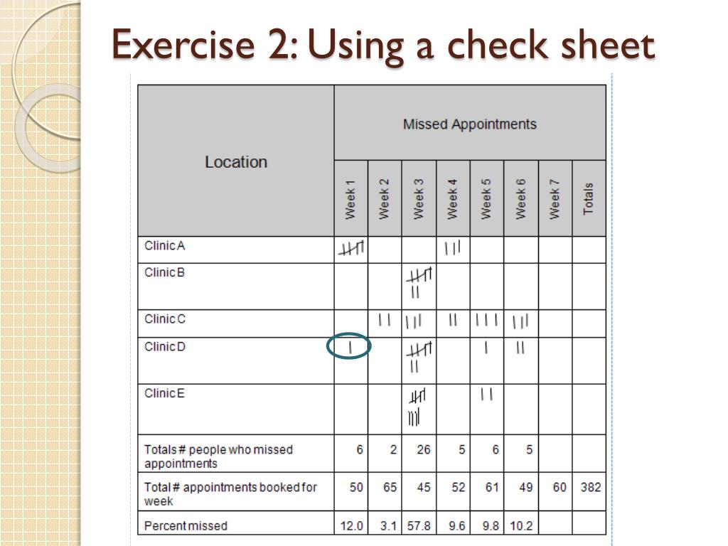 Exercise 3: Calculate Ratios and Rates • Use the counts from the check sheet on page 7 to answer the questions below. • What is the ratio of total missed appointments between Clinic C and Clinic D? • What is the proportion of missed appointments in Week 5 for Clinic E? • What is the rate of missed appointments over the 7 week period?