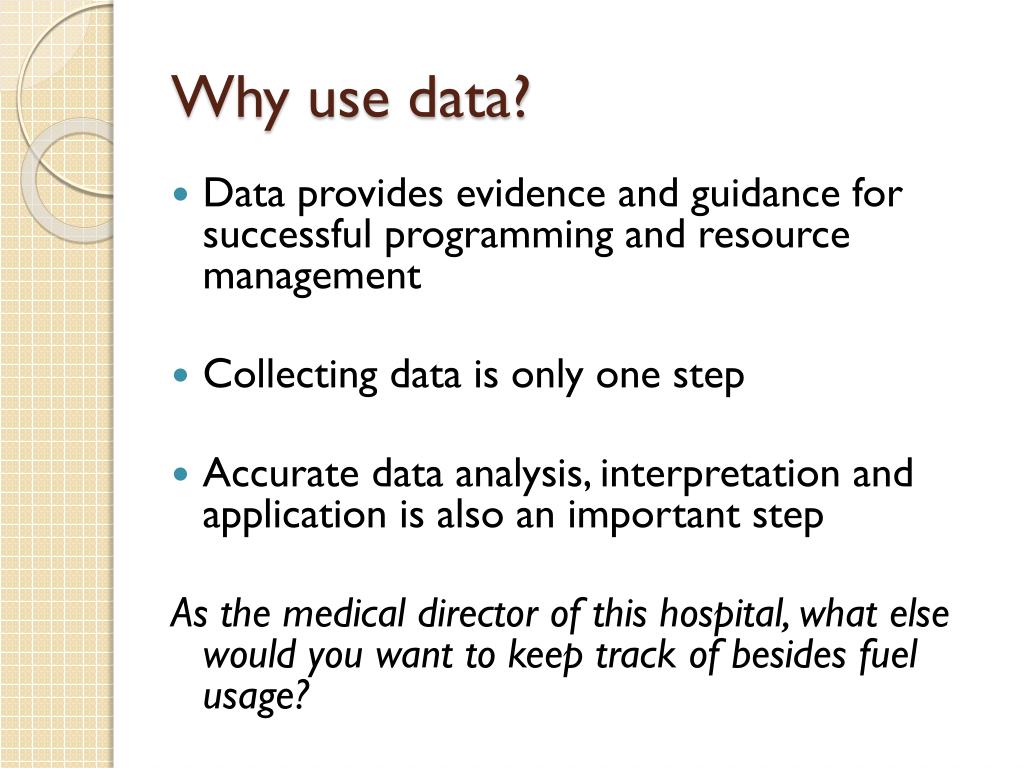 Why use data? • Data provides evidence and guidance for successful programming and resource management • Collecting data is only one step • Accurate data analysis, interpretation and application is also an important step As the medical director of this hospital, what else would you want to keep track of besides fuel usage?