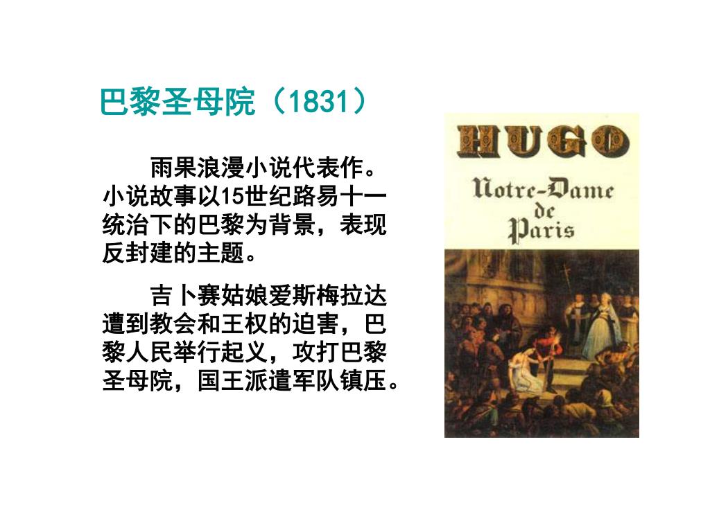 巴黎圣母院(1831) 雨果浪漫小说代表作。小说故事以15世纪路易十一统治下的巴黎为背景,表现反封建的主题。 吉卜赛姑娘爱斯梅拉达遭到教会和王权的迫害,巴黎人民举行起义,攻打巴黎圣母院,国王派遣军队镇压。