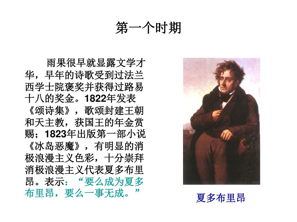 第一个时期 雨果很早就显露文学才华,早年的诗歌受到过法兰西学士院褒奖并获得过路易十八的奖金。1822年发表《颂诗集》,歌颂封建王朝和天主教,获国王的年金赏赐;1823年出版第一部小说《冰岛恶魔》,有明显的消极浪漫主义色彩,十分崇拜消极浪漫主义代表夏多布里昂。表示:“要么成为夏多布里昂,要么一事无成。” 夏多布里昂