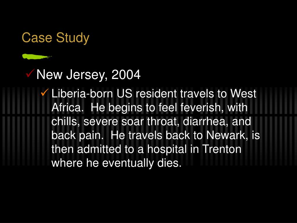 Case Study • New Jersey, 2004 • Liberia-born US resident travels to West Africa. He begins to feel feverish, with chills, severe soar throat, diarrhea, and back pain. He travels back to Newark, is then admitted to a hospital in Trenton where he eventually dies.