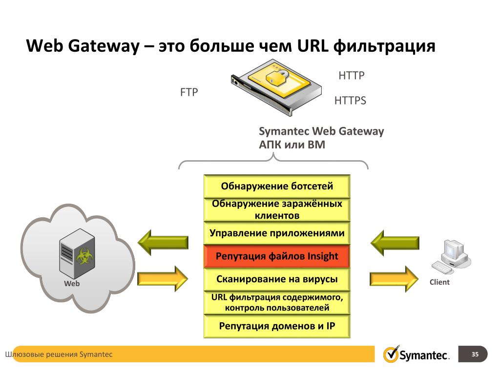 Web Gateway – это больше чем URL фильтрация HTTP FTP HTTPS Symantec Web GatewayАПК или ВМ Репутация файлов Insight Обнаружение заражённых клиентов Обнаружение ботсетей Сканирование на вирусы Управление приложениями URL фильтрация содержимого, контроль пользователей Репутация доменов и IP Client Web Шлюзовые решения Symantec