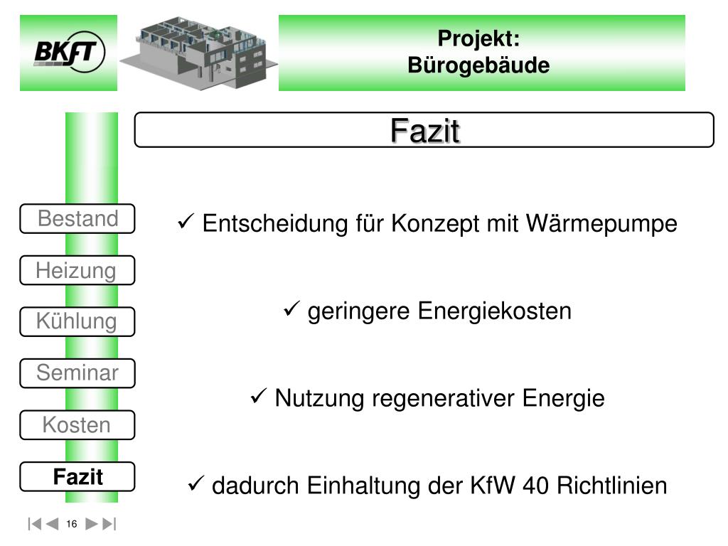Fazit Bestand • Entscheidung für Konzept mit Wärmepumpe • geringere Energiekosten • Nutzung regenerativer Energie • dadurch Einhaltung der KfW 40 Richtlinien Heizung Kühlung Seminar Kosten Fazit