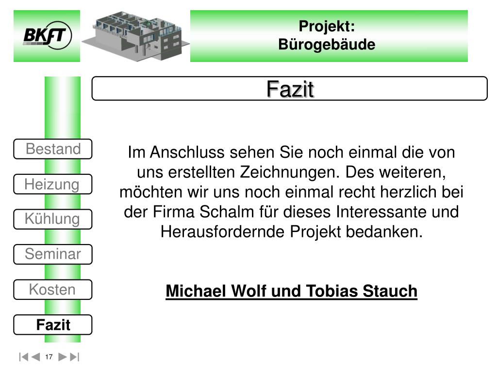 Fazit Bestand Im Anschluss sehen Sie noch einmal die von uns erstellten Zeichnungen. Des weiteren, möchten wir uns noch einmal recht herzlich bei der Firma Schalm für dieses Interessante und Herausfordernde Projekt bedanken. Michael Wolf und Tobias Stauch Heizung Kühlung Seminar Kosten Fazit
