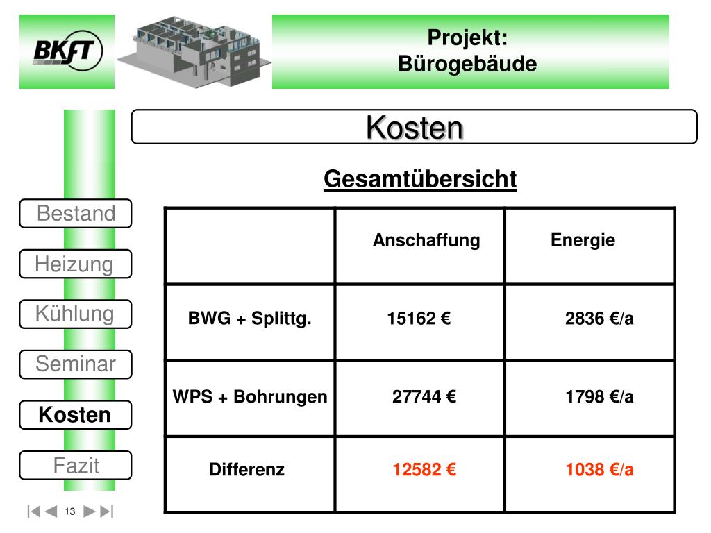 Kosten Gesamtübersicht Bestand Energie Anschaffung Heizung Kühlung BWG + Splittg. 15162 € 2836 €/a Seminar WPS + Bohrungen 27744 € 1798 €/a Kosten Fazit Differenz 12582 € 1038 €/a