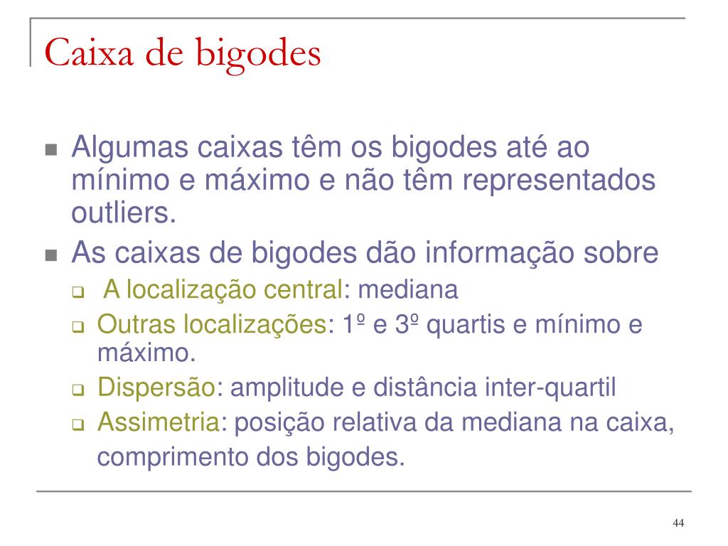 Caixa de bigodes • Algumas caixas têm os bigodes até ao mínimo e máximo e não têm representados outliers. • As caixas de bigodes dão informação sobre • A localização central: mediana • Outras localizações: 1º e 3º quartis e mínimo e máximo. • Dispersão: amplitude e distância inter-quartil • Assimetria: posição relativa da mediana na caixa, comprimento dos bigodes.