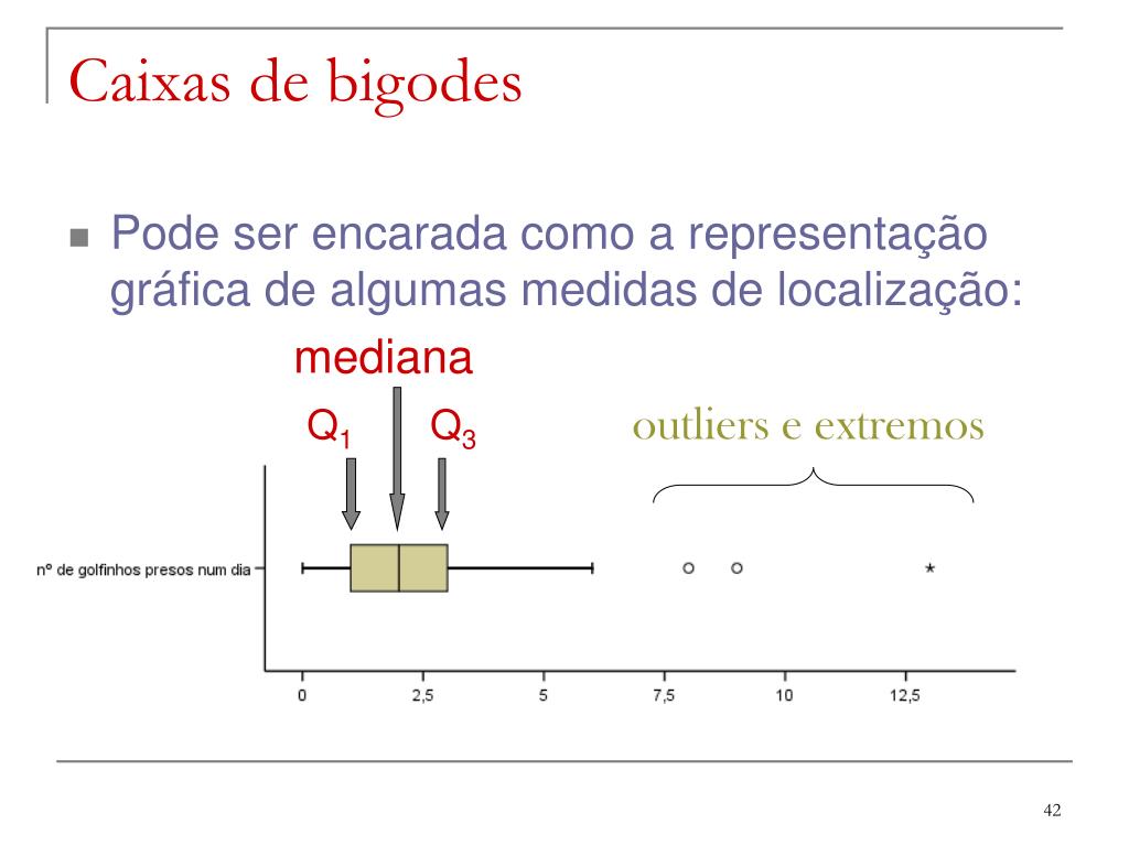 Caixas de bigodes • Pode ser encarada como a representação gráfica de algumas medidas de localização: mediana Q1 Q3outliers e extremos