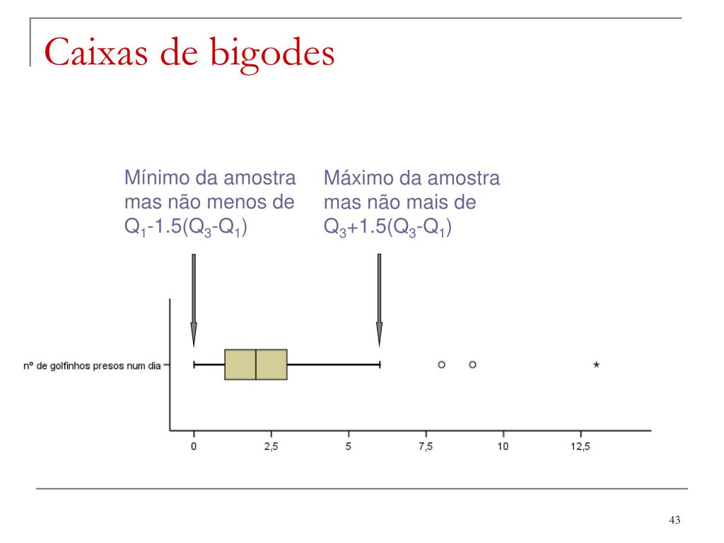 Caixas de bigodes Mínimo da amostra mas não menos de Q1-1.5(Q3-Q1) Máximo da amostra mas não mais de Q3+1.5(Q3-Q1)