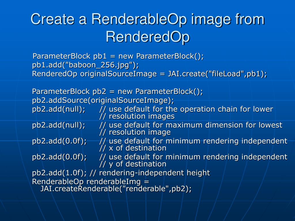 Create a RenderableOp image from RenderedOp ParameterBlock pb1 = new ParameterBlock(); pb1.add("baboon_256.jpg"); RenderedOp originalSourceImage = JAI.create("fileLoad",pb1); ParameterBlock pb2 = new ParameterBlock(); pb2.addSource(originalSourceImage); pb2.add(null); // use default for the operation chain for lower // resolution images pb2.add(null); // use default for maximum dimension for lowest // resolution image pb2.add(0.0f); // use default for minimum rendering independent // x of destination pb2.add(0.0f); // use default for minimum rendering independent // y of destination pb2.add(1.0f); // rendering-independent height RenderableOp renderableImg = JAI.createRenderable("renderable",pb2);