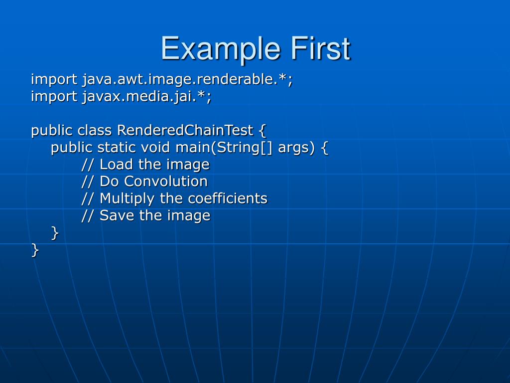 Example First import java.awt.image.renderable.*; import javax.media.jai.*; public class RenderedChainTest { public static void main(String[] args) { // Load the image // Do Convolution // Multiply the coefficients // Save the image } }