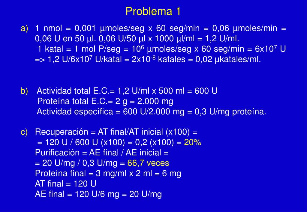 Problema 1 Se ha purificado una enzima a partir de hígado de rata. En la purificación se partió de 500 ml de extracto crudo que contenía 2 g de proteína. 50 µl de ese extracto crudo catalizaban, en condiciones óptimas de ensayo, la producción de 1 nmol de producto en 1 segundo. Tras varios pasos de purificación se obtuvieron 2 ml de una preparación de enzima pura que contenía 3 mg de proteína por mililitro y presentaba una actividad total de 120 U. a) Calcular la concentración de la enzima en el extracto crudo en U/ml y katales/ml. b) Determinar la actividad específica, en U/mg proteína en el extracto crudo. c) Calcular la recuperación del proceso de purificación y el número de veces que se ha purificado la enzima.