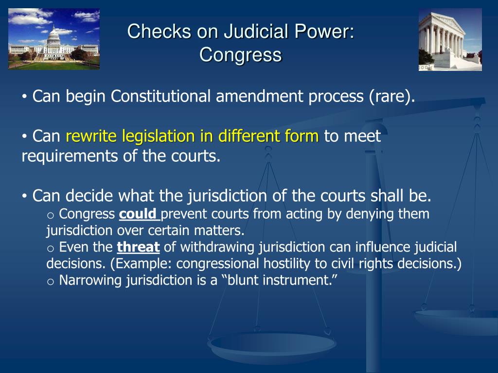 Checks on Judicial Power: Congress • Can begin Constitutional amendment process (rare). • Can rewrite legislation in different form to meet requirements of the courts. • Can decide what the jurisdiction of the courts shall be. • Congress could prevent courts from acting by denying them jurisdiction over certain matters. • Even the threat of withdrawing jurisdiction can influence judicial decisions. (Example: congressional hostility to civil rights decisions.) • Narrowing jurisdiction is a “blunt instrument.”