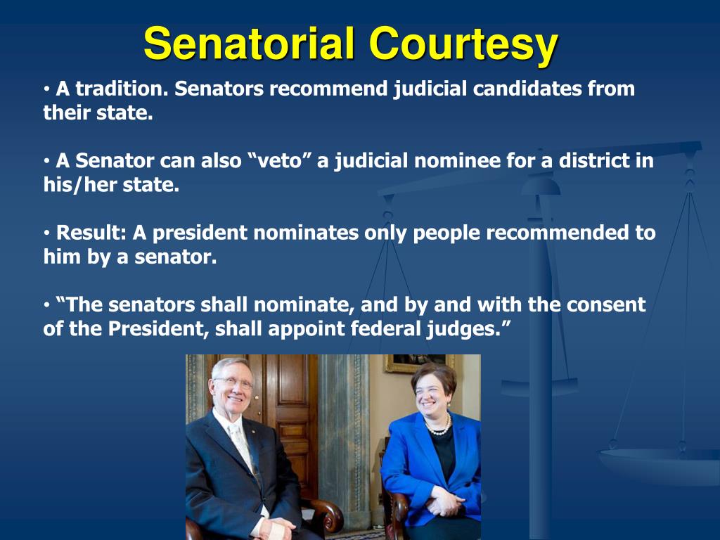 Senatorial Courtesy • A tradition. Senators recommend judicial candidates from their state. • A Senator can also “veto” a judicial nominee for a district in his/her state. • Result: A president nominates only people recommended to him by a senator. • “The senators shall nominate, and by and with the consent of the President, shall appoint federal judges.”