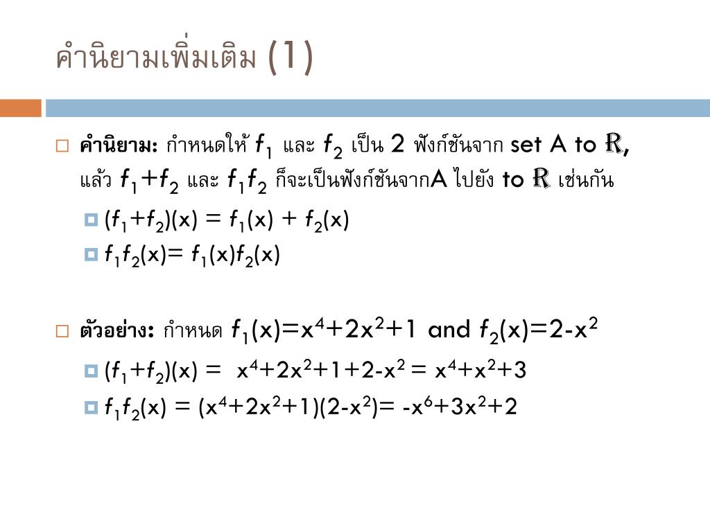 คำนิยามเพิ่มเติม (1) • คำนิยาม: กำหนดให้f1และf2เป็น 2 ฟังก์ชันจาก set A to R,แล้วf1+f2และf1f2ก็จะเป็นฟังก์ชันจากA ไปยังto R เช่นกัน • (f1+f2)(x) = f1(x) + f2(x) • f1f2(x)= f1(x)f2(x) • ตัวอย่าง:กำหนดf1(x)=x4+2x2+1 and f2(x)=2-x2 • (f1+f2)(x) = x4+2x2+1+2-x2 = x4+x2+3 • f1f2(x) = (x4+2x2+1)(2-x2)= -x6+3x2+2