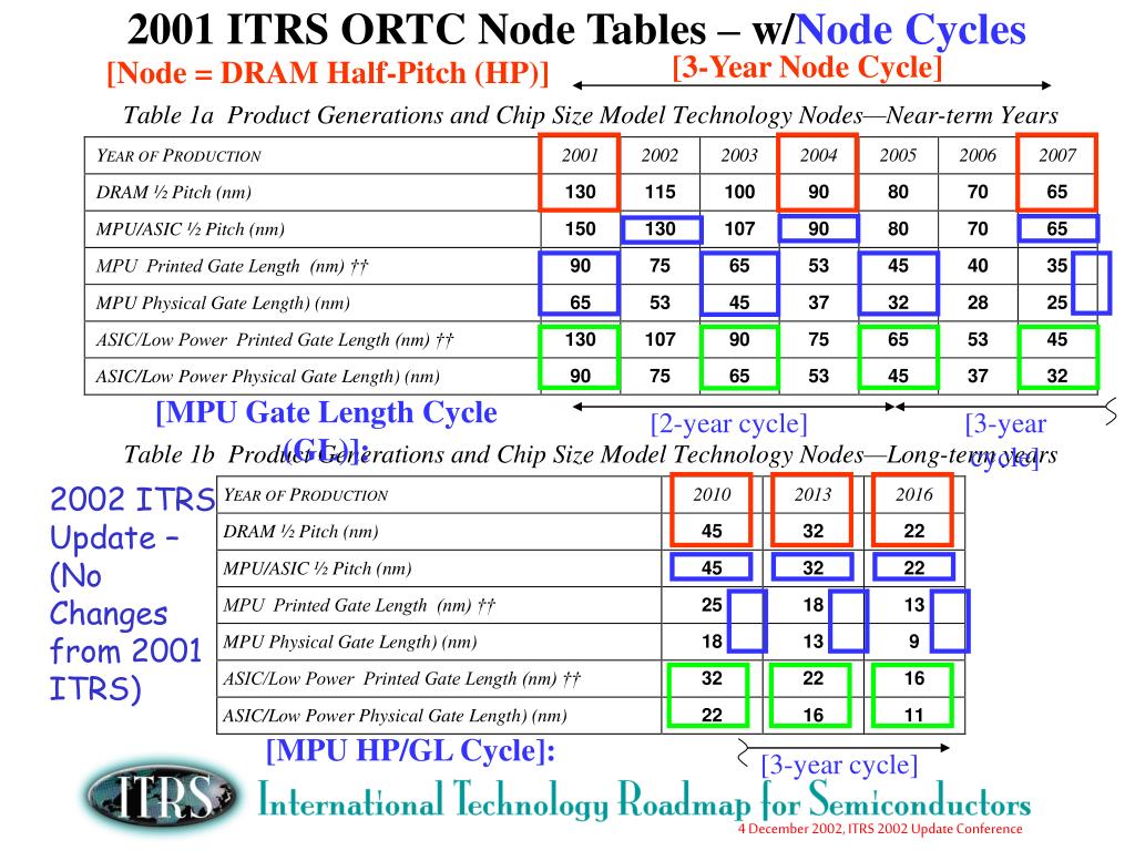[3-Year Node Cycle] [Node = DRAM Half-Pitch (HP)] [MPU Gate Length Cycle (GL)]: [2-year cycle] [3-year cycle] 2002 ITRS Update – (No Changes from 2001 ITRS) [MPU HP/GL Cycle]: [3-year cycle] 2001 ITRS ORTC Node Tables – w/Node Cycles