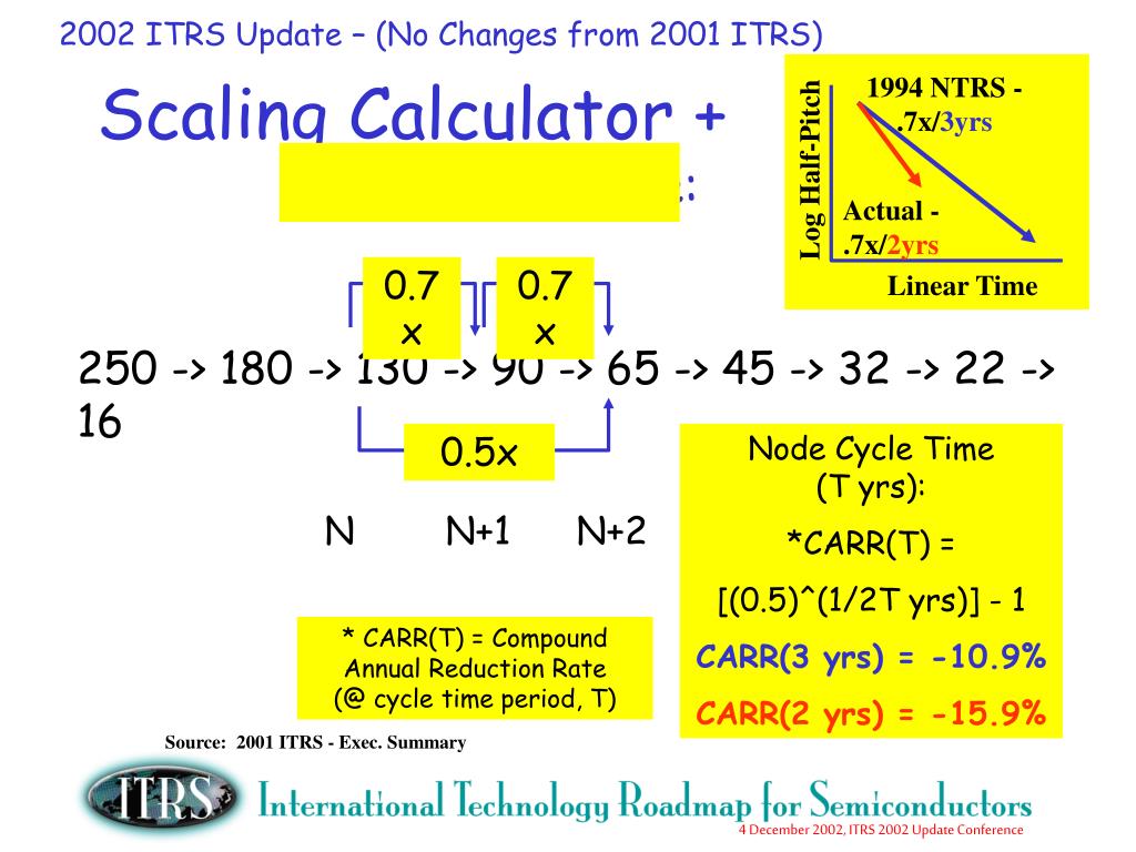2002 ITRS Update – (No Changes from 2001 ITRS) 1994 NTRS - .7x/3yrs Log Half-Pitch Actual - .7x/2yrs 0.7x 0.7x Linear Time 250 -> 180 -> 130 -> 90 -> 65 -> 45 -> 32 -> 22 -> 16 Node Cycle Time (T yrs): *CARR(T) = [(0.5)^(1/2T yrs)] - 1 CARR(3 yrs) = -10.9% CARR(2 yrs) = -15.9% 0.5x N N+1 N+2 * CARR(T) = Compound Annual Reduction Rate (@ cycle time period, T) Source: 2001 ITRS - Exec. Summary Scaling Calculator + Node Cycle Time: