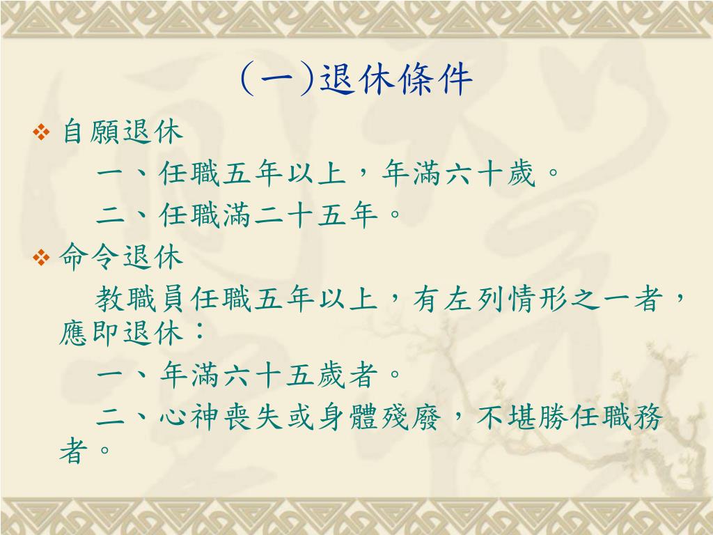 (一)退休條件 • 自願退休 一、任職五年以上,年滿六十歲。 二、任職滿二十五年。 • 命令退休 教職員任職五年以上,有左列情形之一者,應即退休: 一、年滿六十五歲者。 二、心神喪失或身體殘廢,不堪勝任職務者。