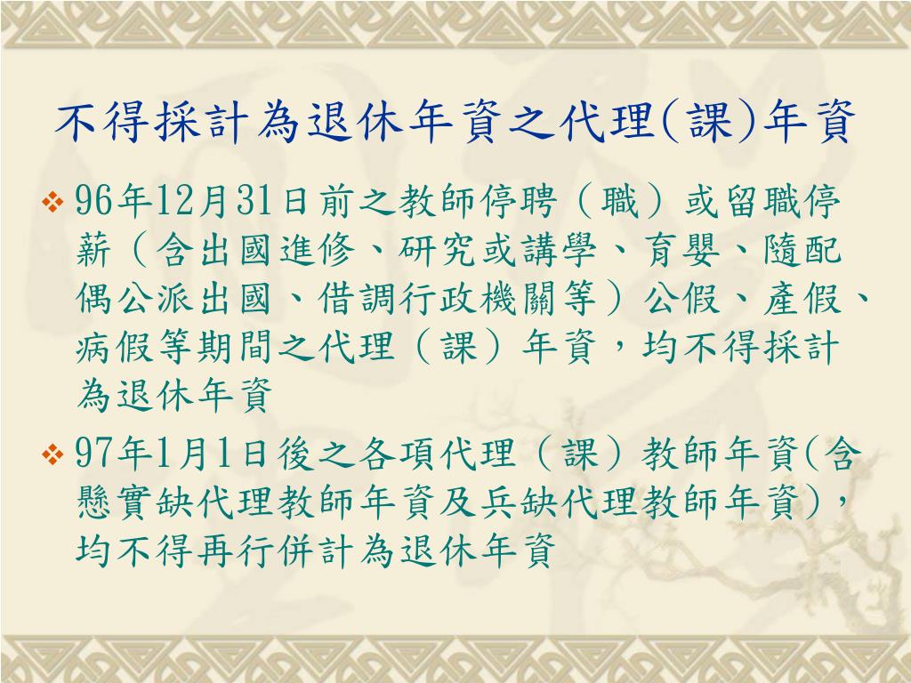 不得採計為退休年資之代理(課)年資 • 96年12月31日前之教師停聘(職)或留職停薪(含出國進修、研究或講學、育嬰、隨配偶公派出國、借調行政機關等)公假、產假、病假等期間之代理(課)年資,均不得採計為退休年資 • 97年1月1日後之各項代理(課)教師年資(含懸實缺代理教師年資及兵缺代理教師年資),均不得再行併計為退休年資