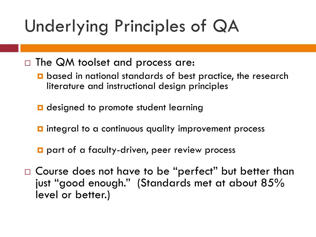 Underlying Principles of QA • The QM toolset and process are: • based in national standards of best practice, the research literature and instructional design principles • designed to promote student learning • integral to a continuous quality improvement process • part of a faculty-driven, peer review process • Course does not have to be “perfect” but better than just “good enough.” (Standards met at about 85% level or better.)