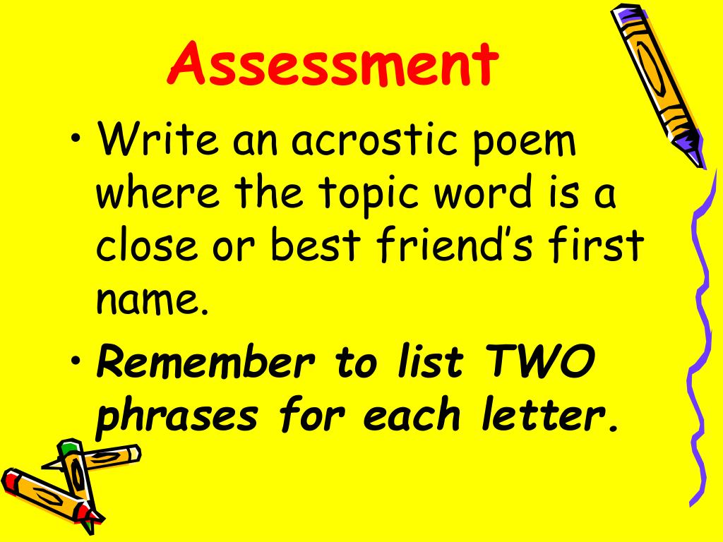 Assessment • Write an acrostic poem where the topic word is a close or best friend’s first name. • Remember to list TWO phrases for each letter.